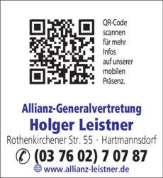 Die Adresse von Allianz-Generalvertretung Holger Leistner lautet: Rothenkirchener Str. 55, 08107 Hartmannsdorf