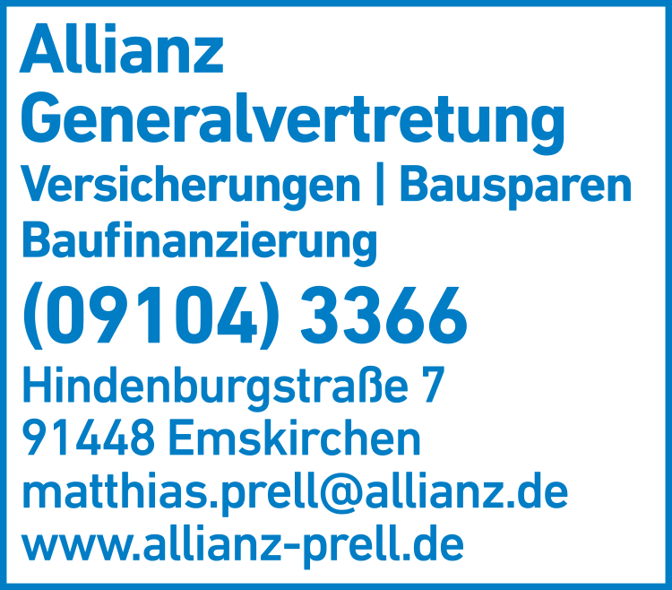 Die Adresse von Allianz Hauptvertretung Matthias Prell lautet: Hindenburgstr. 7, 91448 Emskirchen