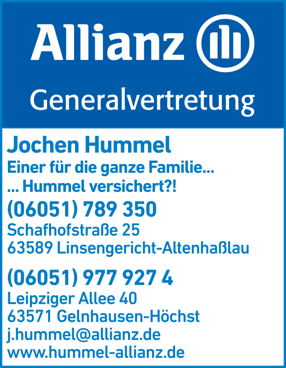 Die Adresse von Allianz Hummel Jochen Versicherung lautet: Schafhofstr. 25, 63589 Linsengericht