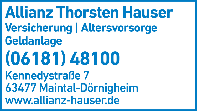 Die Adresse von Allianz Thorsten Hauser Versicherungen lautet: Kennedystr. 7, 63477 Maintal