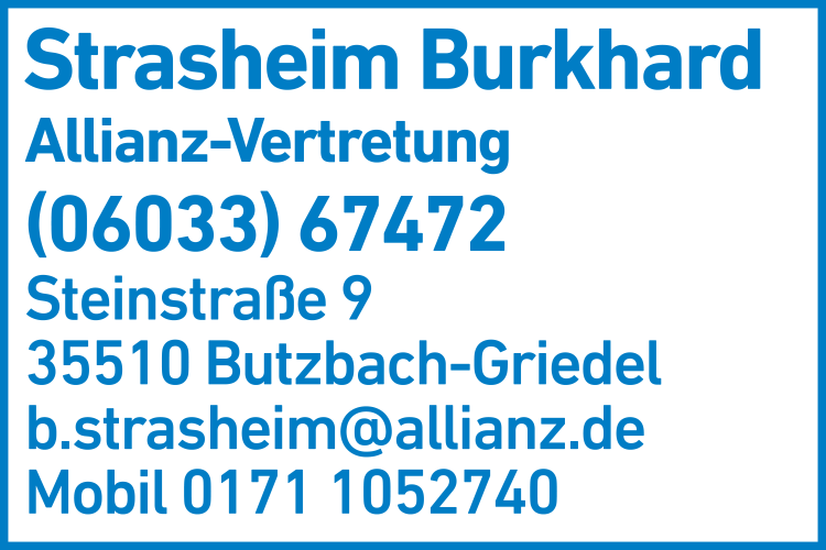 Die Adresse von Allianz Versicherungen Strasheim Burkhard lautet: Steinstr. 9, 35510 Butzbach