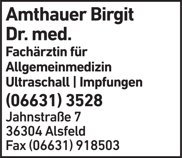 Die Adresse von Amthauer Birgit Dr. med. Fachärztin für Allgemeinmedizin lautet: Jahnstr. 7, 36304 Alsfeld