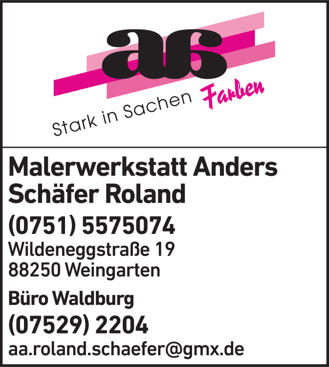 Die Adresse von Anders Malerwerkstatt lautet: Wildeneggstr. 19, 88250 Weingarten