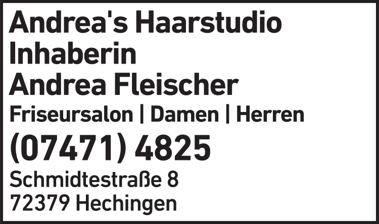 Die Adresse von Andrea's Haarstudio lautet: Schmidtestr. 8, 72379 Hechingen