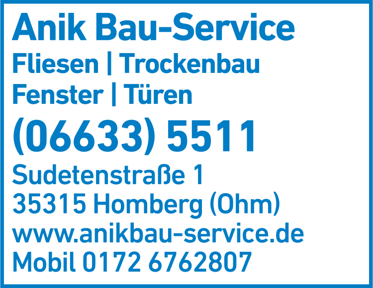 Die Adresse von Anik Bau-Service lautet: Sudetenstr. 1, 35315 Homberg (Ohm)
