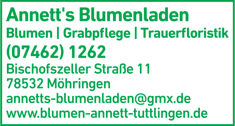 Annett's Blumenladen Blumenhandlung 07462 12 62 Tuttlingen Bischofszeller Str. 11 78532 Möhringen