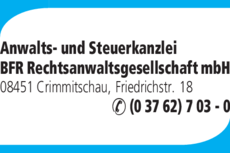 Die Adresse von Anwalts- und Steuerkanzlei BFR Rechtsanwaltsgesellschaft mbH lautet: Friedrichstr. 18, 08451 Crimmitschau