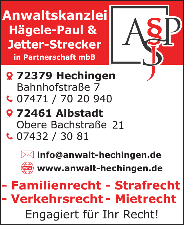 Anwaltskanzlei Hägele-Paul & Jetter-Strecker in Partnerschaft mbB 07471 7 02 09 40 Hechingen Bahnhofstr. 7 72379 5 5 10