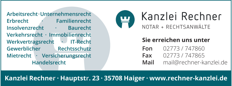 Anwaltskanzlei Rechner Notar, Rechtsanwälte 02773 7 47 86-0 Haiger Hauptstr. 23 35708 4 5 4