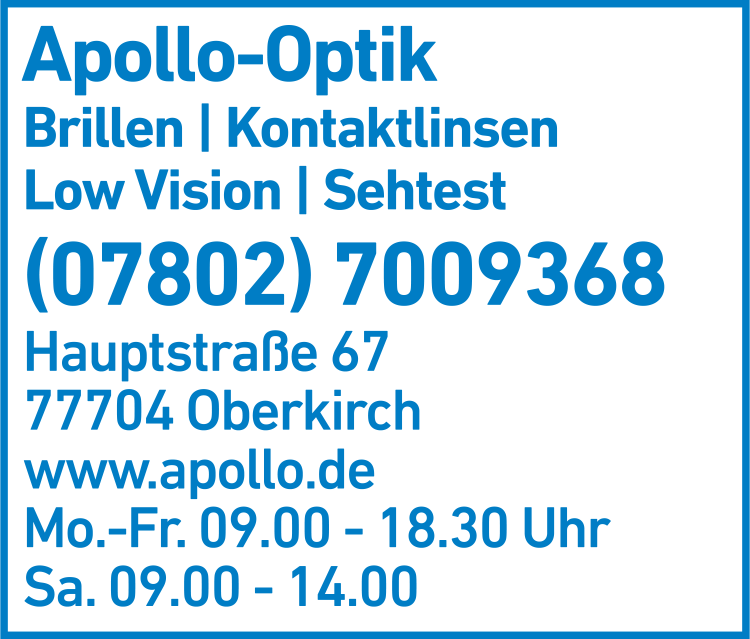 Die Adresse von Apollo-Optik lautet: Hauptstr. 67, 77704 Oberkirch