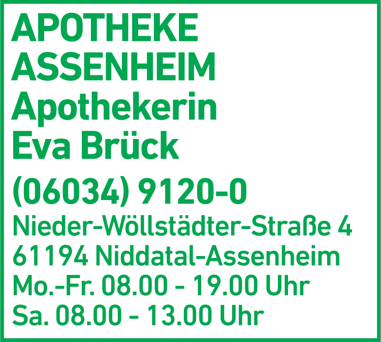 Die Adresse von Apotheke Assenheim lautet: Nieder-Wöllstädter Str. 4, 61194 Niddatal-Assenheim
