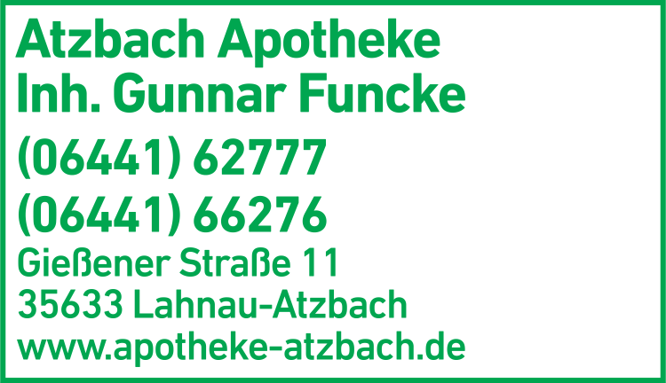 Die Adresse von Apotheke Atzbach lautet: Gießener Str. 11, 35633 Lahnau-Atzbach