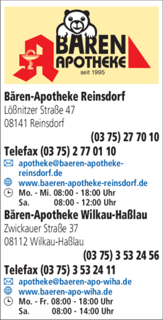 Öffnungszeiten Bären-Apotheke Wilkau-Haßlau: Mo - Fr 08:00 - 18:00 UhrSa 08:00 - 14:00 Uhr