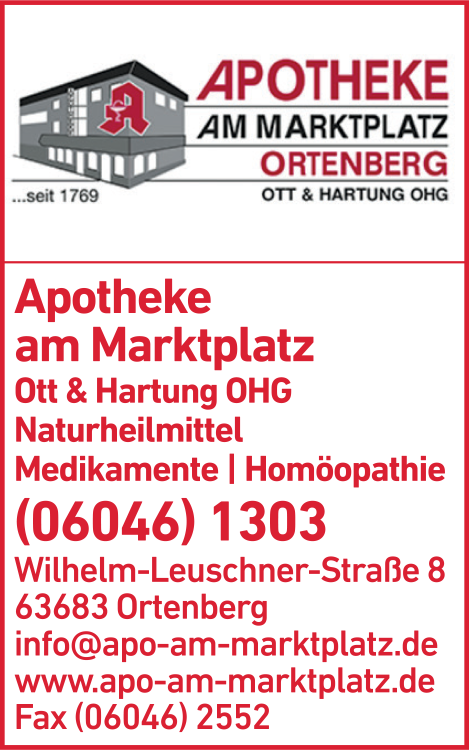 Die Adresse von Apotheke am Marktplatz lautet: Wilhelm-Leuschner-Str. 8, 63683 Ortenberg