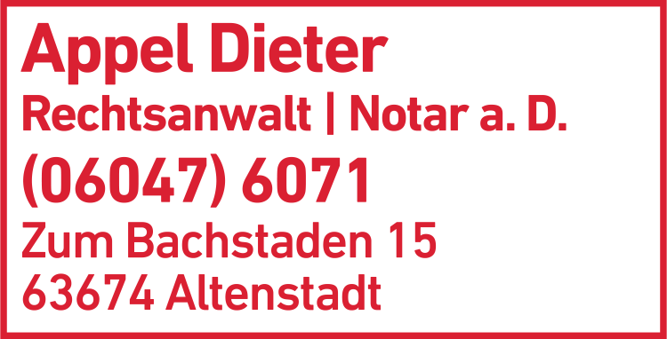Die Adresse von Appel Dieter Rechtsanwalt, Notar a. D. lautet: Zum Bachstaden 15, 63674 Altenstadt