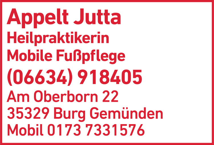Appelt Jutta Heilpraktikerin 06634 91 84 05 Burg Gemünden Am Oberborn 22 35329 Burg-Gemünden