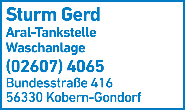 Die Adresse von Aral-Tankstelle Sturm Gerd Tankstelle lautet: Bundesstr. 416, 56330 Kobern-Gondorf