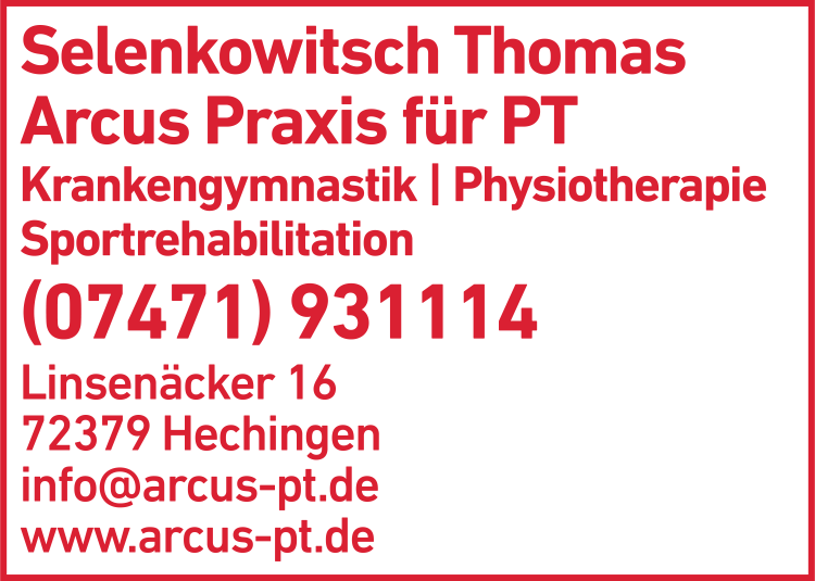 Die Adresse von Arcus Praxis für Physiotherapie lautet: Linsenäcker 16, 72379 Hechingen