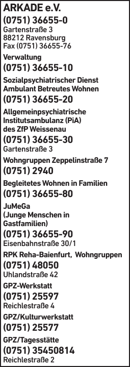 Die Adresse von Arkade e.V. lautet: Gartenstr. 3, 88212 Ravensburg