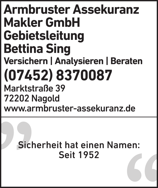 Die Adresse von Armbruster Assekuranz Makler GmbH lautet: Marktstr. 39, 72202 Nagold