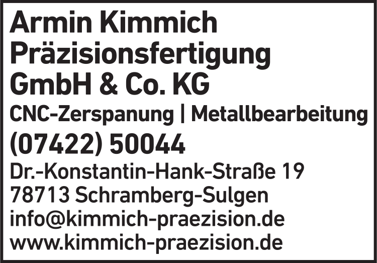 Die Adresse von Armin Kimmich Präzisionsfertigung GmbH & Co. KG Metallbearbeitung lautet: Dr.-Konstantin-Hank-Str. 19, 78713 Schramberg