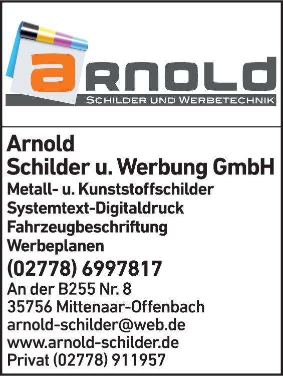 Die Adresse von Arnold Schilder u. Werbung GmbH lautet: An der B255 Nr. 8, 35756 Mittenaar-Offenbach
