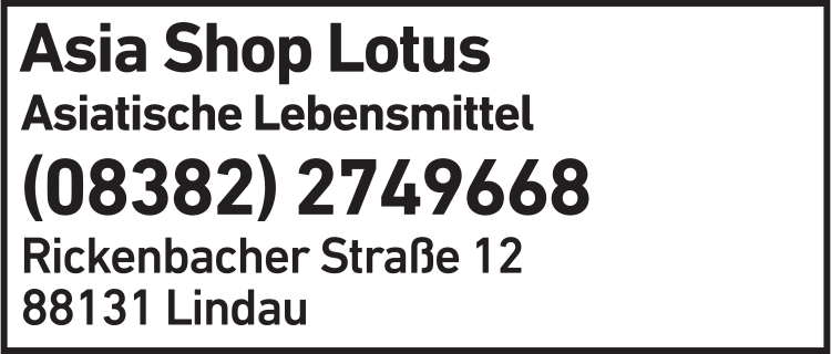 Die Adresse von Asia Shop Lotus lautet: Rickenbacher Str. 12, 88131 Lindau