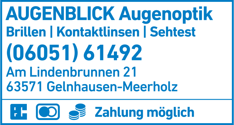 Die Adresse von Augenblick Augenoptik Inh. Dirk Schlegelmilch lautet: Am Lindenbrunnen 21, 63571 Gelnhausen-Meerholz