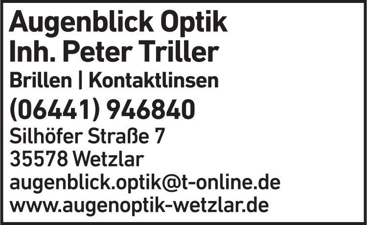Die Adresse von Augenblick Optik Inh. Peter Triller lautet: Silhöfer Str. 7, 35578 Wetzlar