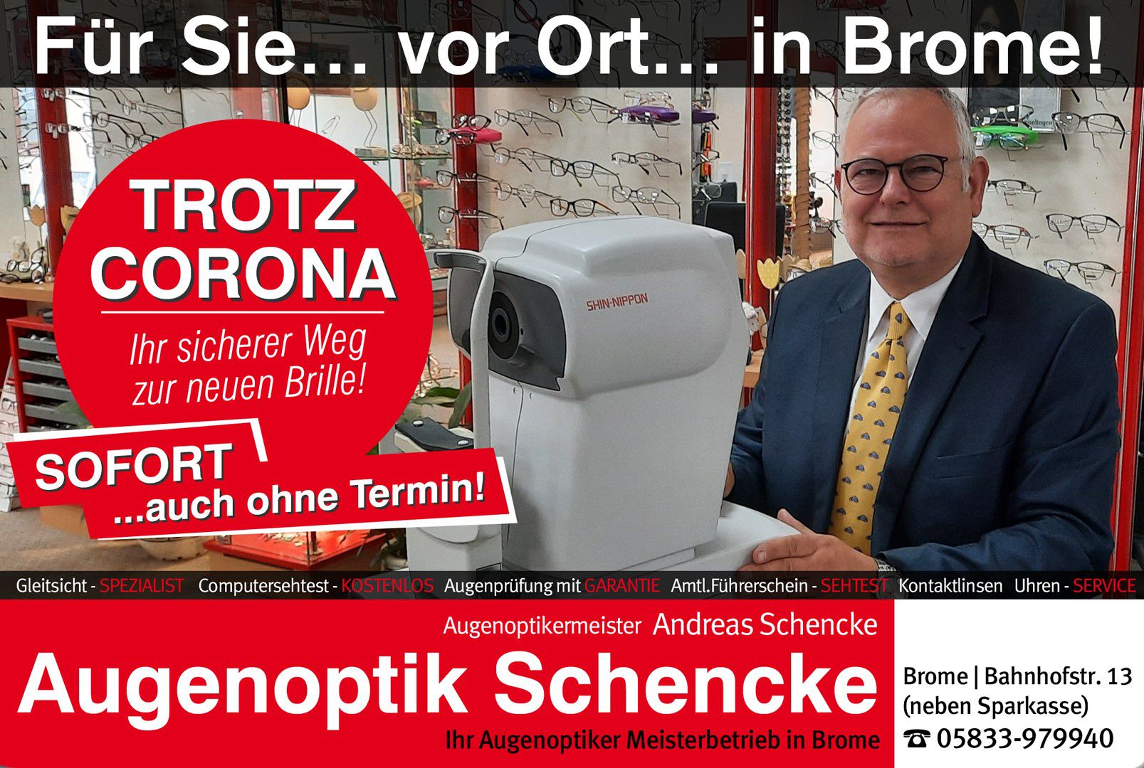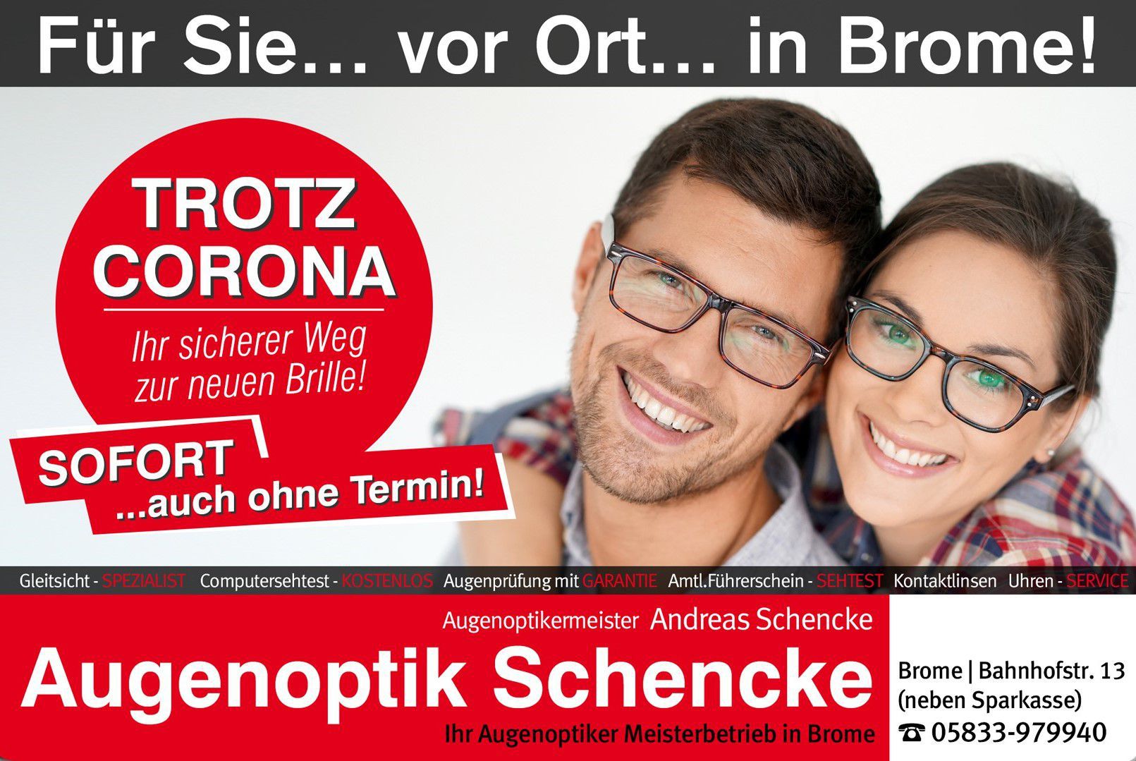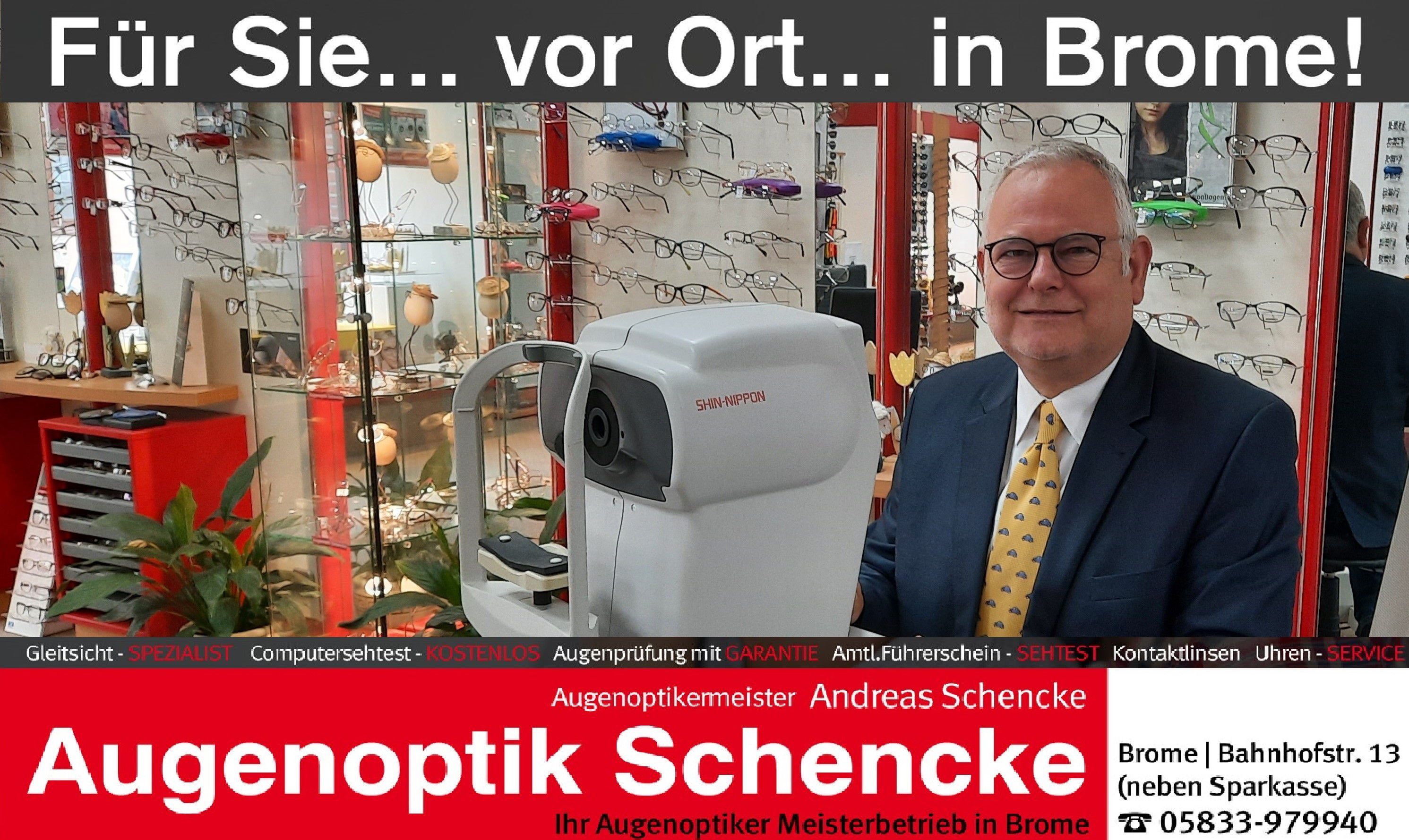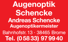Die Adresse von Augenoptik Schencke Andreas lautet: Bahnhofstr. 13, 38465 Brome