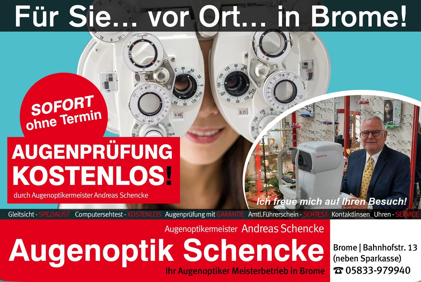 Augenoptik Schencke Andreas bietet Optiker, Kontaktlinsen, Brillenanpassung, Brillenreparatur, Augenuntersuchung, Führerscheinsehtest, Sonnenbrillen, Sportbrillen, Brillenwerkstatt und Optikermeister als Produkt(e) an