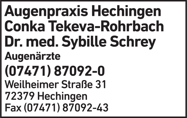Die Adresse von Augenpraxis Hechingen lautet: Weilheimer Str. 31, 72379 Hechingen