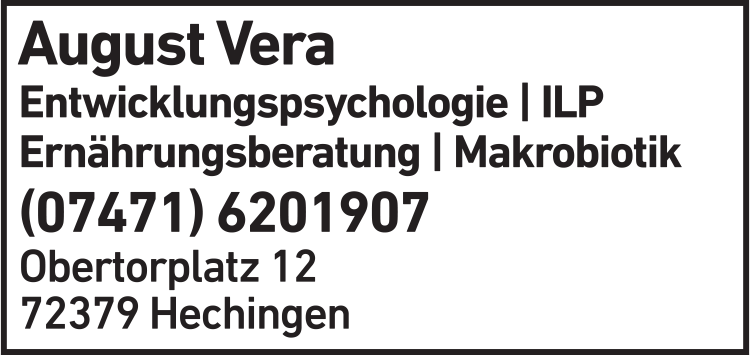 Die Adresse von August Vera lautet: Obertorplatz 12, 72379 Hechingen