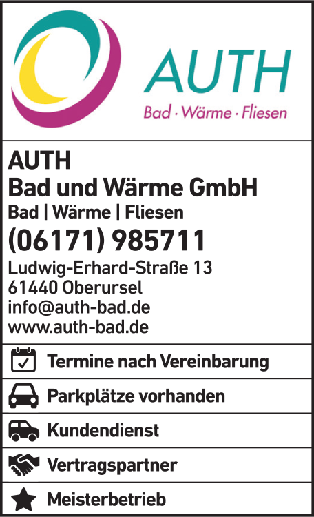 Auth Bad und Wärme GmbH Heizung, Badrenovierung 06171 98 57 11 Oberursel Ludwig-Erhard-Str. 13 61440 Stierstadt 5 5 2