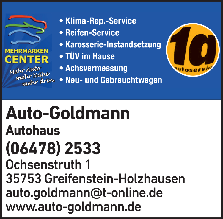 Die Adresse von Auto Goldmann lautet: Ochsenstruth 1, 35753 Greifenstein-Holzhausen