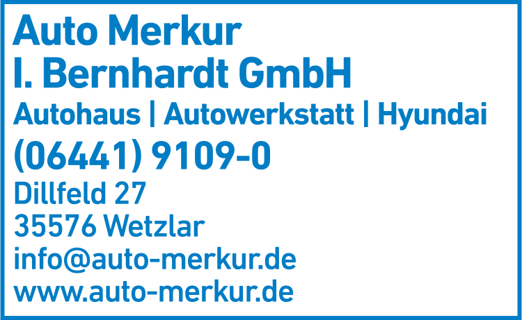 Die Adresse von Auto-Merkur I. Bernhardt GmbH lautet: Dillfeld 27, 35576 Wetzlar