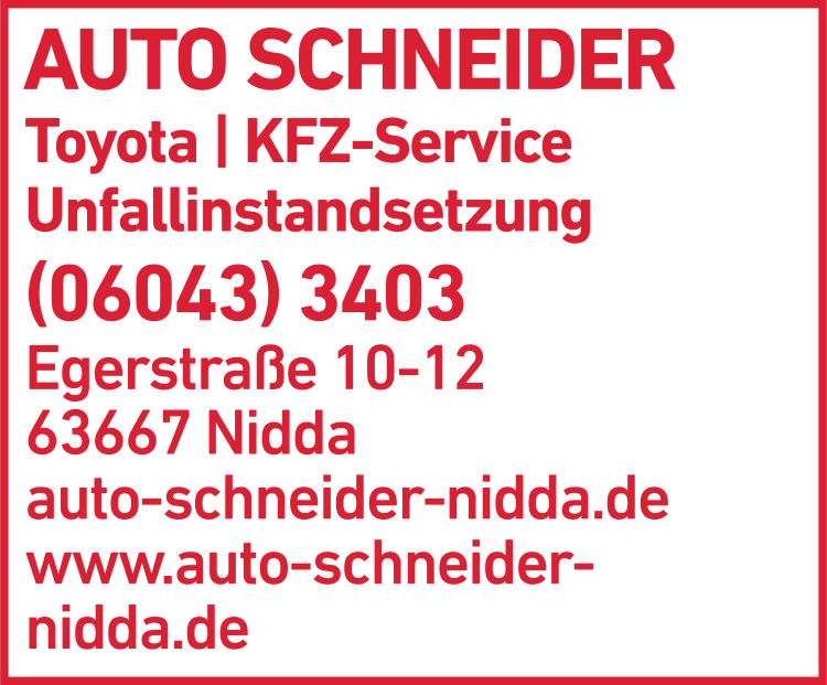 Auto Schneider TOYOTA-Servicehändler 06043 34 03 Nidda Egerstr. 10-12 63667 Harb