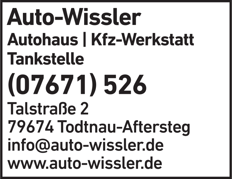 Die Adresse von Auto-Wissler lautet: Talstr. 2, 79674 Todtnau