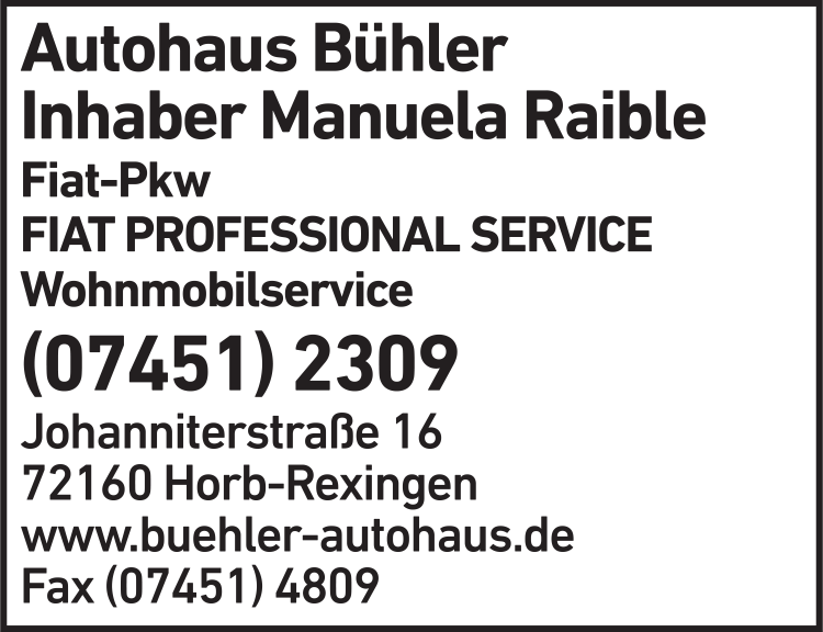 Autohaus Bühler FIAT Autorisierter Servicepartner 07451 23 09 Horb am Neckar-Rexingen Johanniterstr. 16 72160 Rexingen de.teleauskunft.oetb.webapp2.detail.Graphic@762f49ea 3 5 4