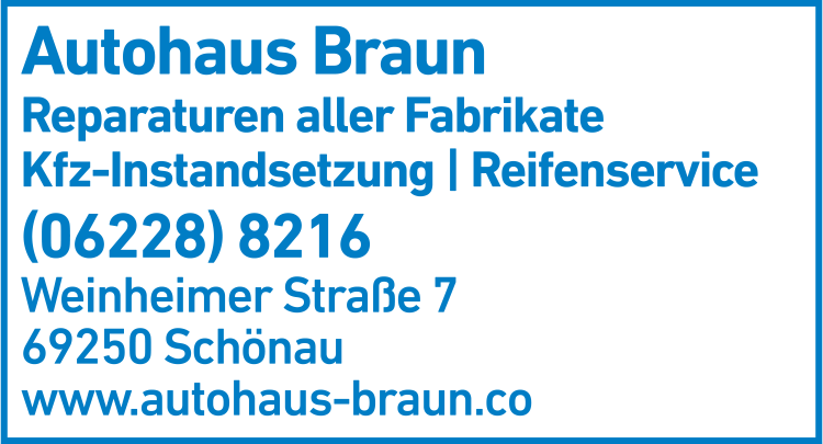 Die Adresse von Autohaus Braun, Inh. Timo Schmid Kfz-Instandsetzung lautet: Weinheimer Str. 7, 69250 Schönau
