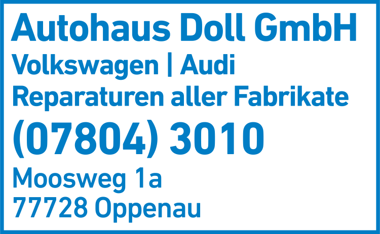 Die Adresse von Autohaus Doll GmbH lautet: Moosweg 1 a, 77728 Oppenau