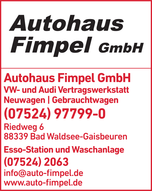 Die Adresse von Autohaus Fimpel GmbH lautet: Riedweg 6, 88339 Bad Waldsee