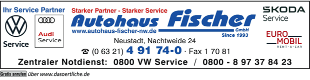 Die Adresse von Autohaus Fischer GmbH lautet: Nachtweide 24, 67433 Neustadt an der Weinstraße