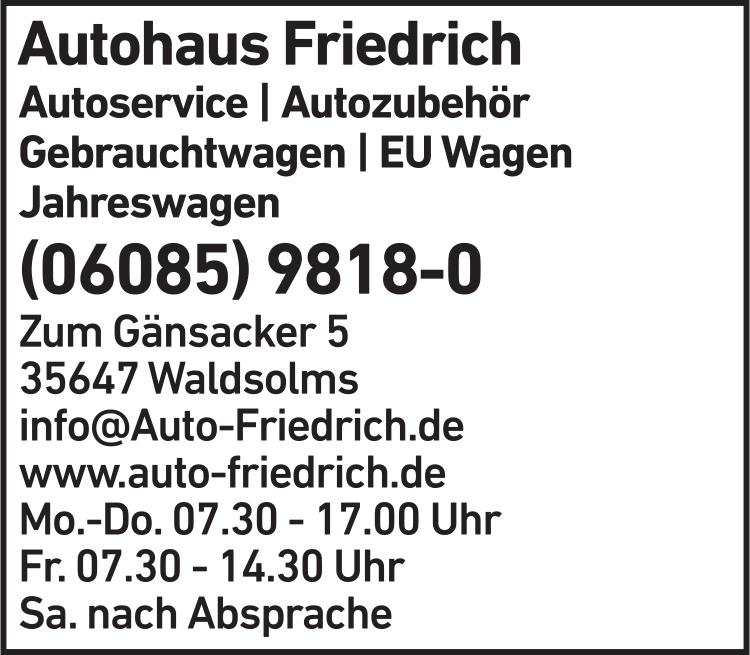 Die Adresse von Autohaus Friedrich lautet: Zum Gänsacker 5, 35647 Waldsolms
