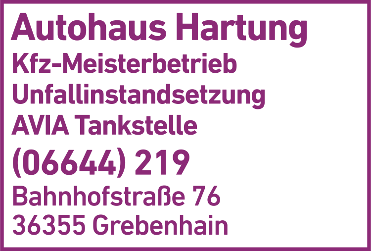 Die Adresse von Autohaus Hartung OHG Kfz-Meisterbetrieb lautet: Bahnhofstr. 76, 36355 Grebenhain
