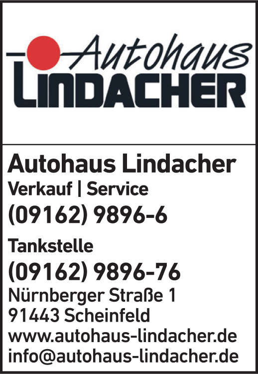 Die Adresse von Autohaus Lindacher GmbH & Co. KG lautet: Nürnberger Str. 1, 91443 Scheinfeld