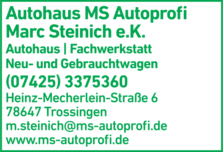 Die Adresse von Autohaus MS Autoprofi lautet: Heinz-Mecherlein-Str. 6, 78647 Trossingen