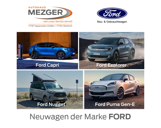 Autohaus Mezger Oberkirch führt die Marke(n) Ford, Mustang, Nugget, Transit, S-Max, Ranger, Explorer und Duma.