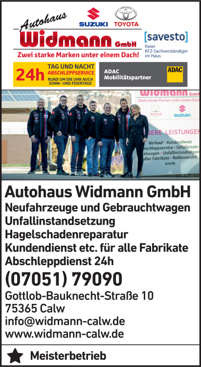 Die Adresse von Autohaus Widmann GmbH lautet: Gottlob-Bauknecht-Str. 10, 75365 Calw