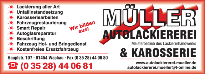 Die Adresse von Autolackiererei Müller Müller Autolackiererei & Karosserie lautet: Hauptstr. 107, 01454 Wachau